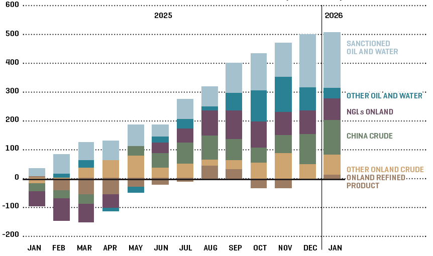 A significant portion of China’s crude imports has flowed into strategic reserves, as well as into new refining capacity and pipeline fill, effectively removing barrels from the market. Excluding China, global onshore crude inventories in early 2026 are tracking close to their five-year average, according to Kayrros data — hardly an overwhelmingly bearish signal.